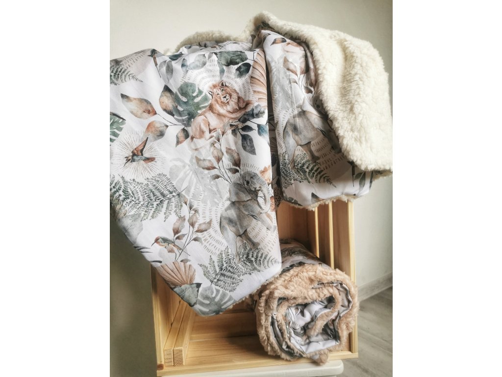 Autorský vzor Jungle na hebkém sametu a hřejivý, bavlněný beránek. Lehké jako peříčko, přitom teploučké. Pohlazení na dotek i duši.