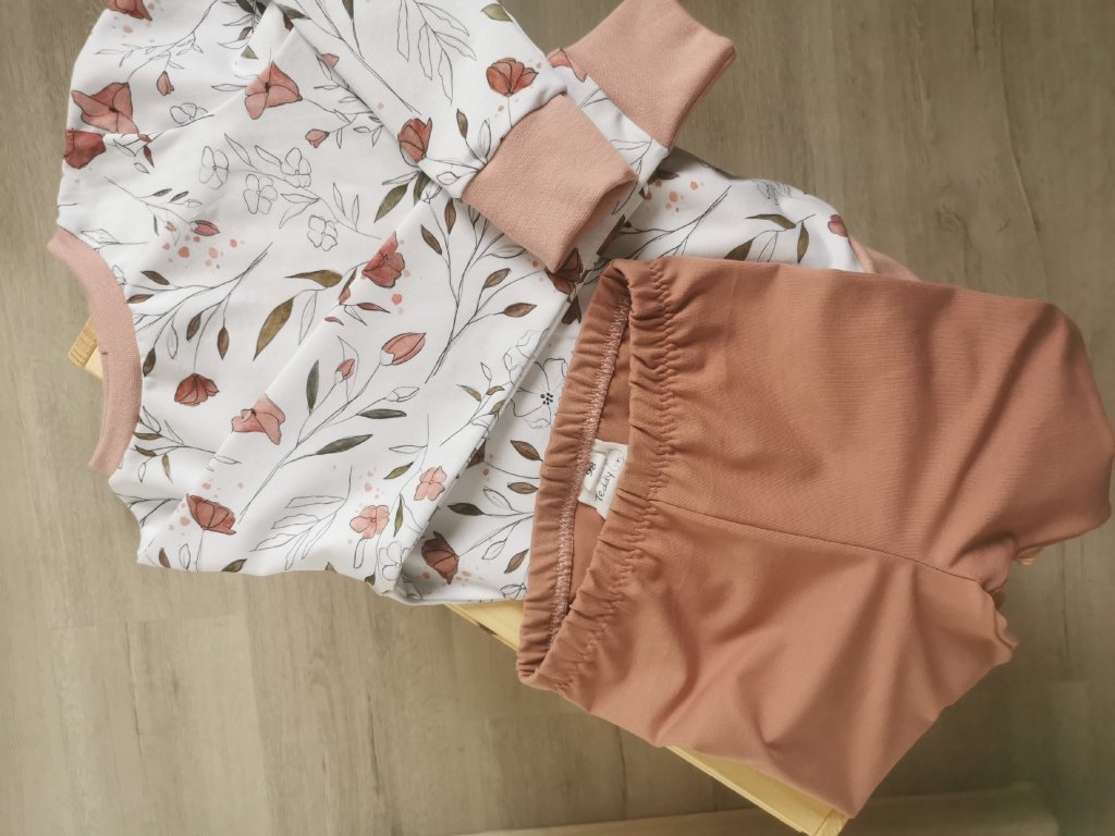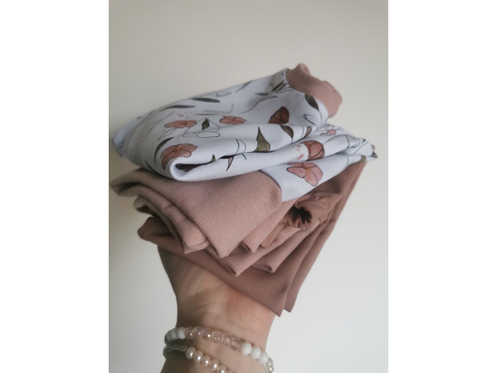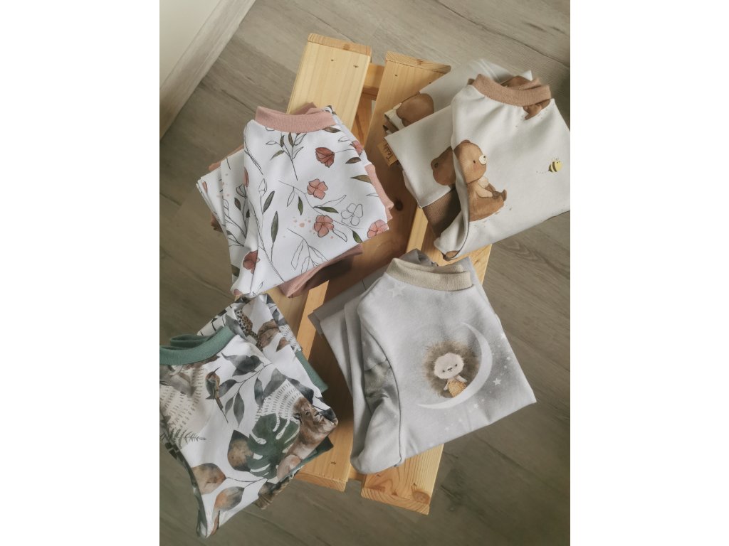 Pyžamo se skládá ze dvou dílů. Vrchní, volnější střih má prodlouženou délku, aby zůstala záda v teple. Navíc je dole zakončený napletem, který zabraňuje vyhrnování. Stejný naplet je také na rukávech a nohavicích.