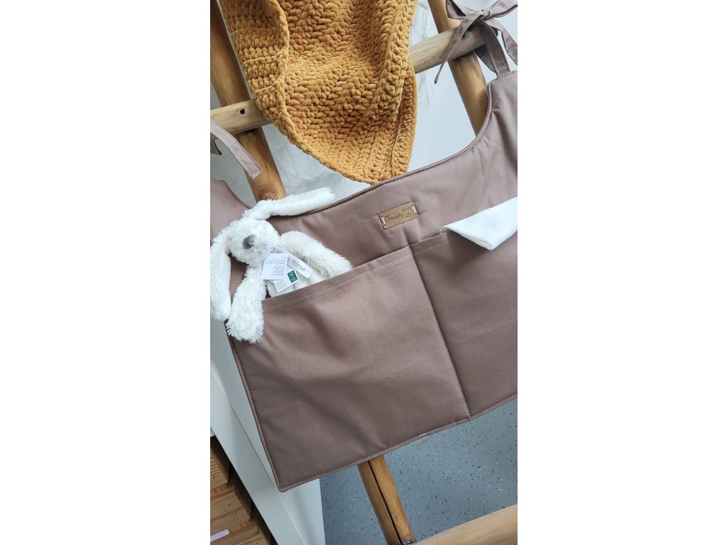 Kapsář na postýlku v hnědé barvě je praktický organizér, který vám pomůže udržet všechny drobnosti pro miminko přehledně uložené. Díky dvěma prostorným kapsám můžete mít u postýlky vždy připravené vše potřebné – například dudlík, pleny, malou hračku nebo lahvičku.