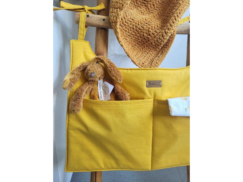 Kapsář na postýlku v hořčicové barvě je skvělým pomocníkem pro udržení pořádku kolem miminka. Díky dvěma praktickým kapsám budete mít přehledně uložené vše, co potřebujete – dudlík, pleny, malou hračku nebo lahvičku – přímo u postýlky.