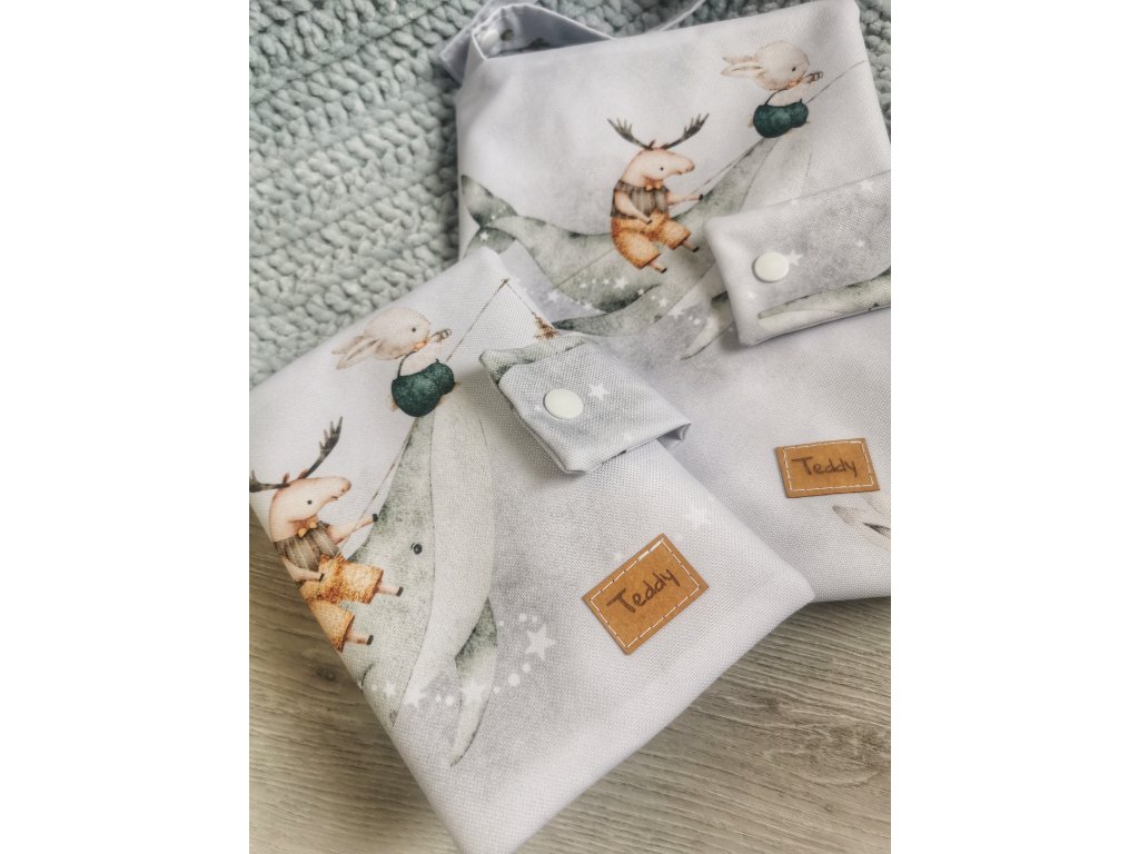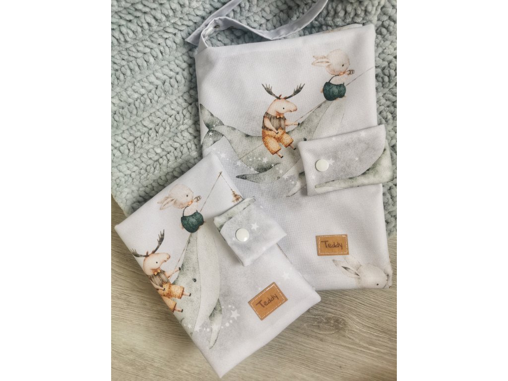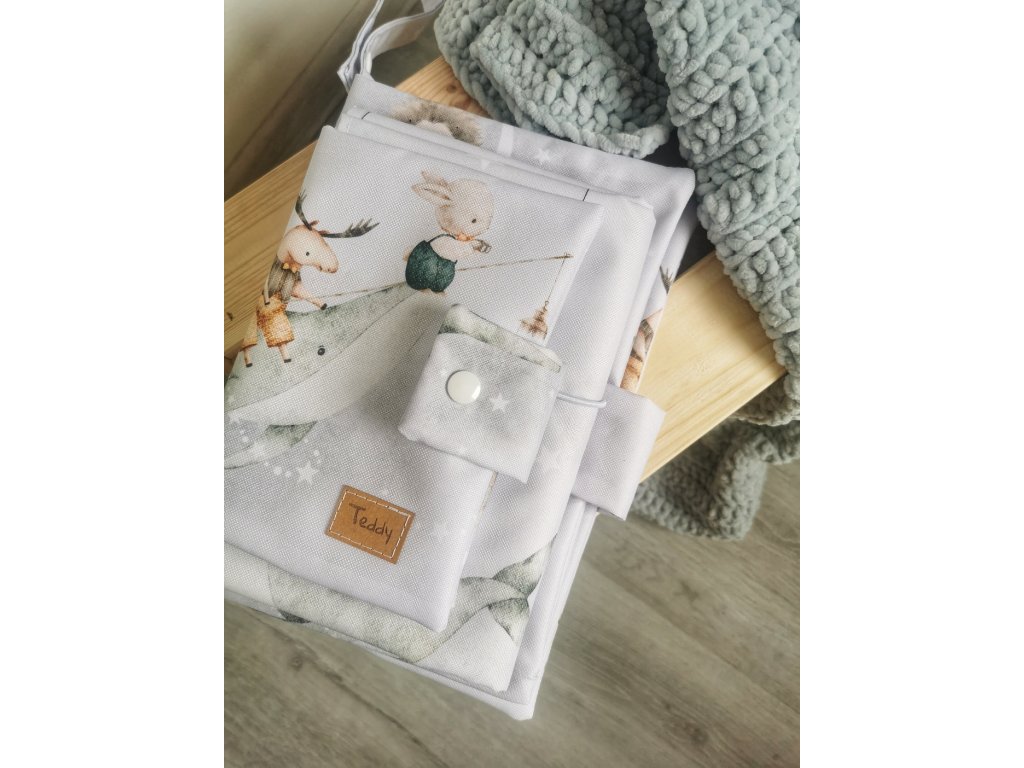 Celá cestovní sada za zvýhodněnou cenu. Obsahuje plenkovník, obal na očkovací průkaz a přebalovací podložku s autorským vzorem...