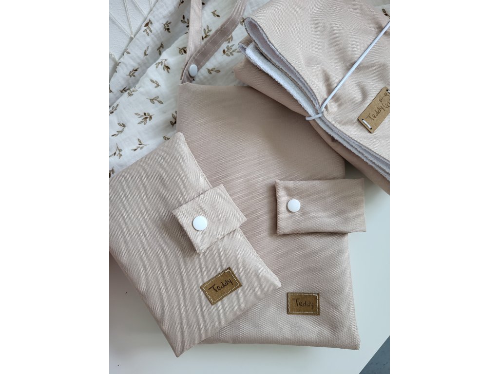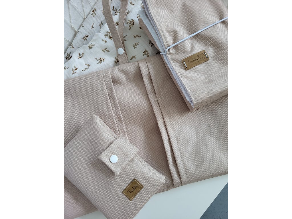 Všechny produkty v sadě jsou vyrobeny z kvalitní kočárkoviny, která je odolná, snadno omyvatelná a chrání obsah před nečistotami. Díky promyšlenému designu je tato sada nejen praktická, ale i esteticky atraktivní.