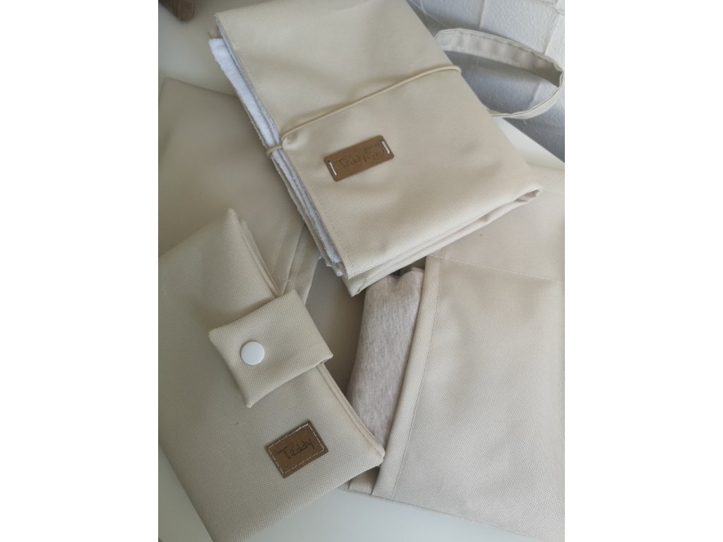 Všechny produkty v sadě jsou vyrobeny z kvalitní kočárkoviny, která je odolná, snadno omyvatelná a chrání obsah před nečistotami. Díky promyšlenému designu je tato sada nejen praktická, ale i esteticky atraktivní.