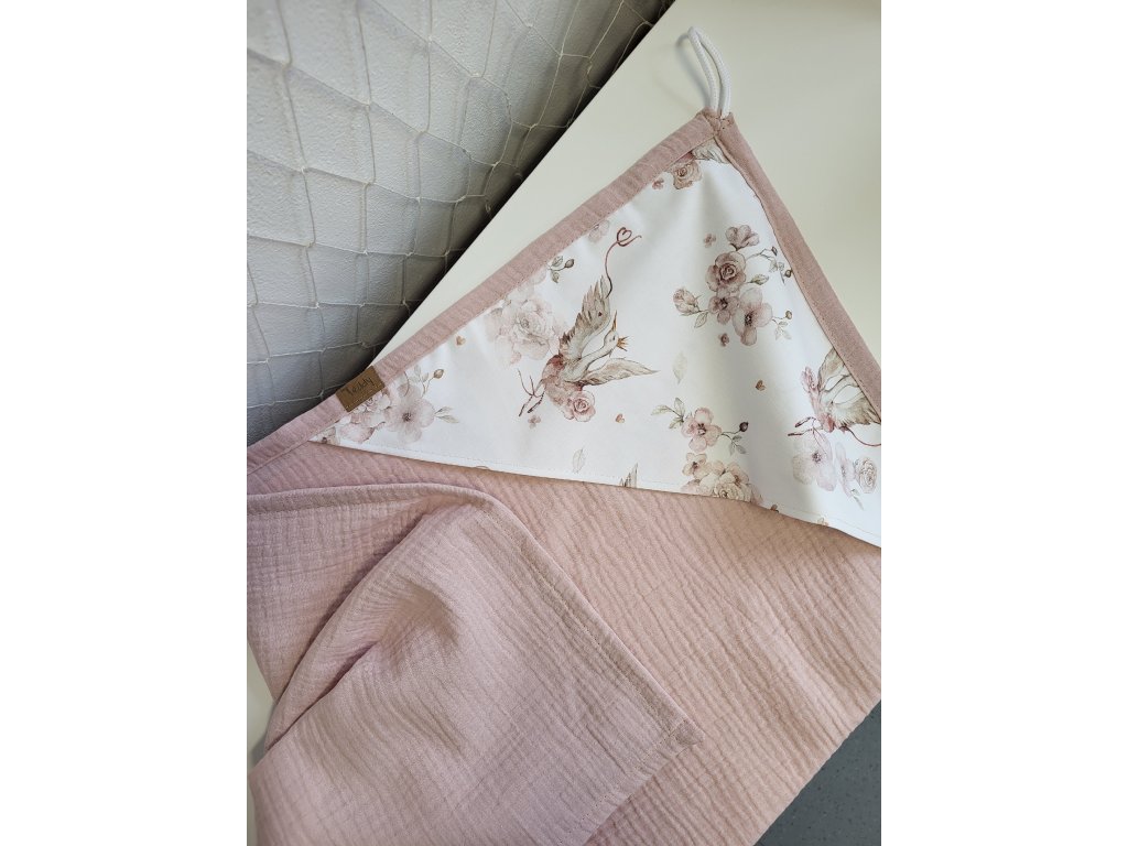 Základem je mušelín, doplněný o stylovou a praktickou kapuci z prémiové bavlny a jednoduché poutko na zavěšení.