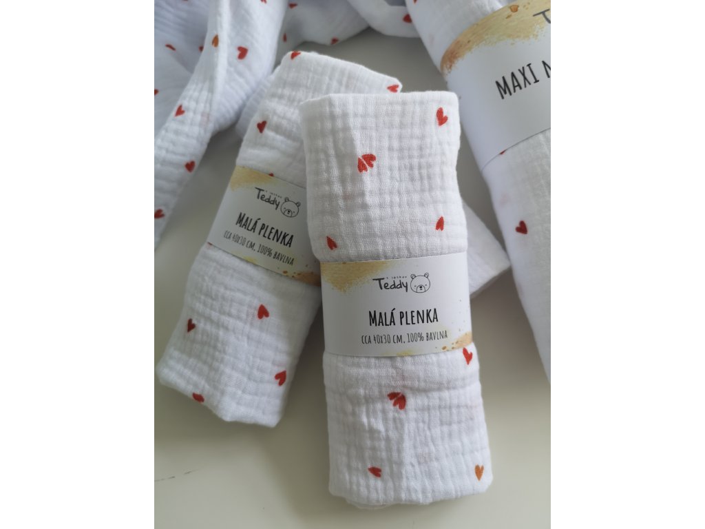 Mušelínová plenka MALÁ 40 x 30 cm - červená srdíčka