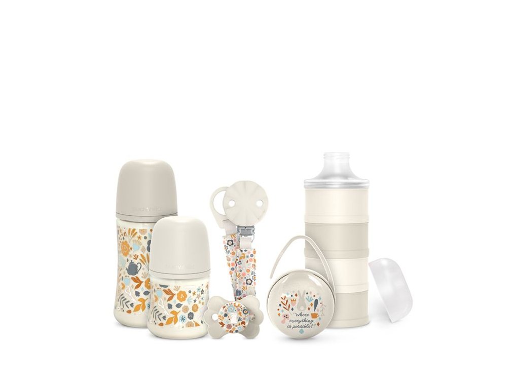 - 1 lahvička o objemu 270 ml s fyziologickou (kulatou) silikonovou savičkou s 3-pozičním průtokem, který umožňuje nastavit lahvičku dle schopnosti sání dítěte. 3-poziční savičkou lze koordinovat sílu průtoku pokrmu pouhým pootáčením. Širokohrdlá láhev umožňuje rodičům snazší mytí a přípravu pokrmu, láhev je lépe stabilní