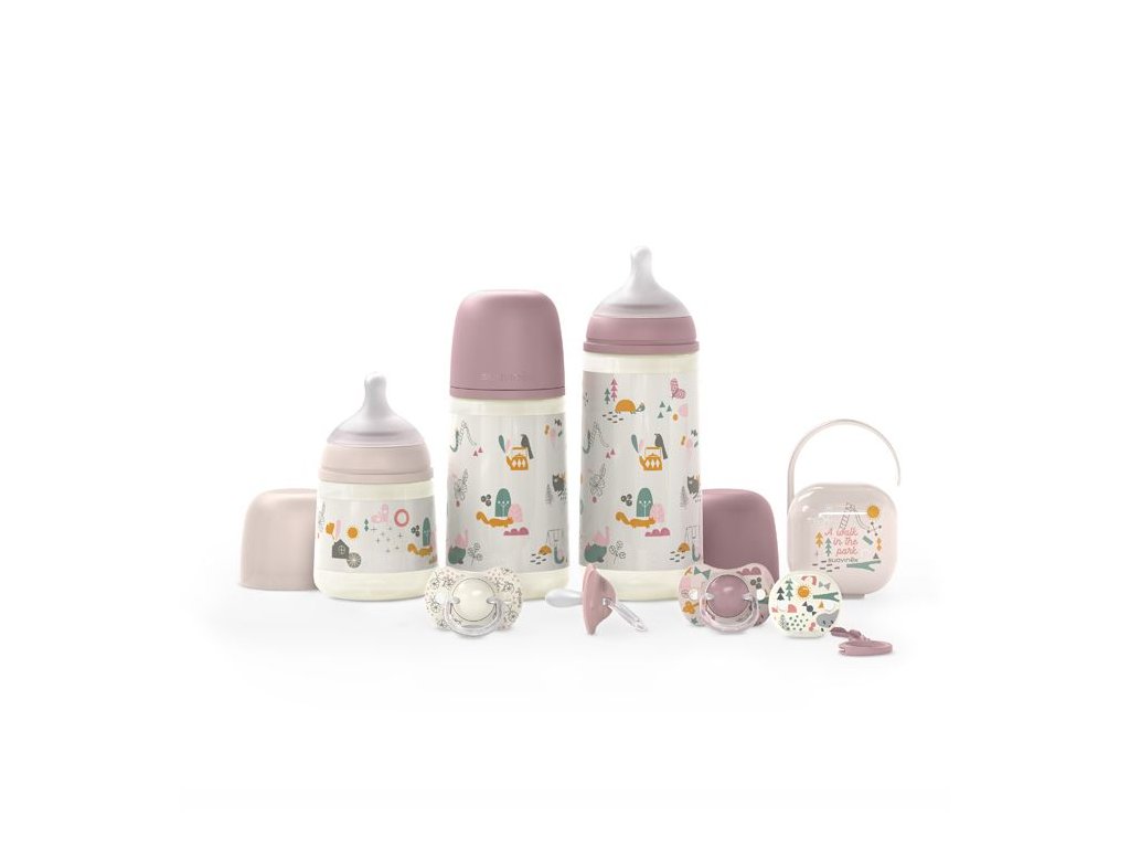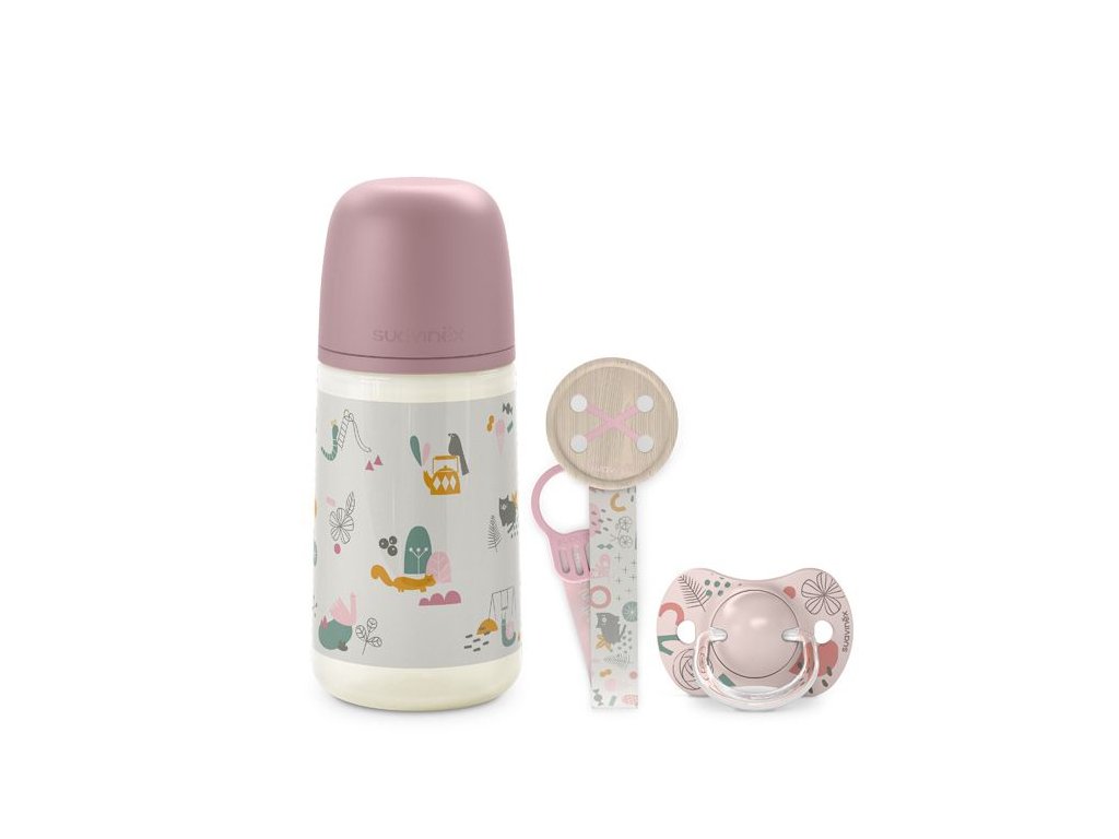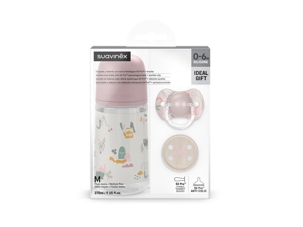 SUAVINEX | Sada láhev 270ml + dudlík fyziologický 0/6m + klip Walk - růžová